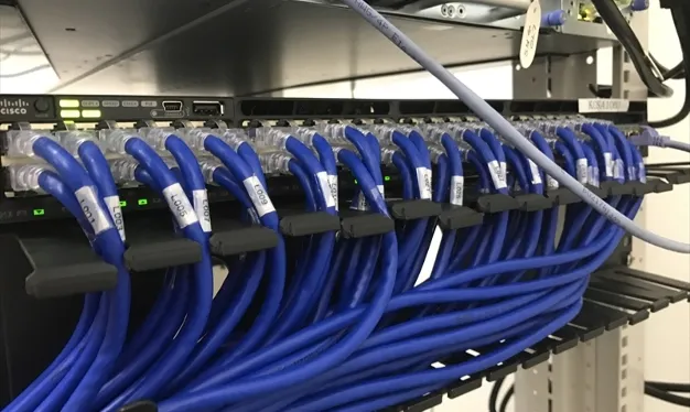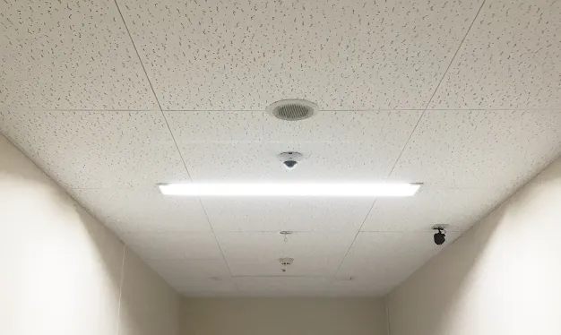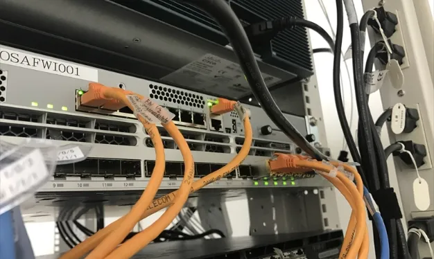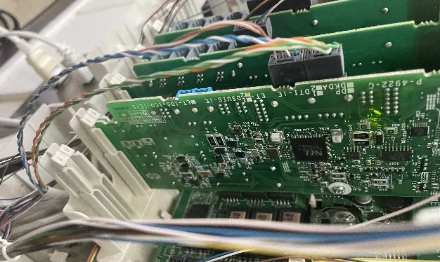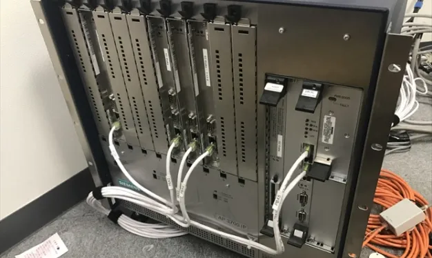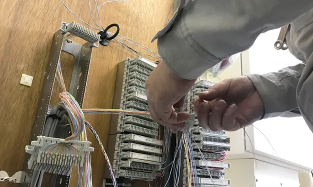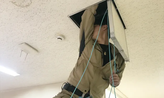 新築工場内で、高所作業車を使用してアクセスポイント設置しました。PoeHUBより有線LANケーブルを配線して無線機器を設置しています。大規模工事も当社にお任せください。