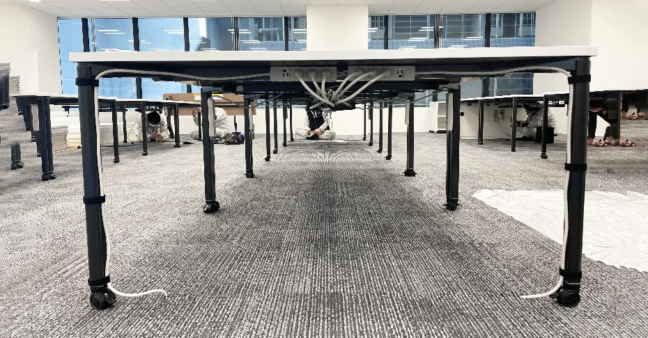 オフィス立ち上げに伴う配線工事を行いました。床下を通し配線ルートを確保。各テーブルの配置、電源ケーブルの長さを考慮し、整線。 極力オフィス空間の景観を損なわず、かつ、機能性を持たせるレイアウトに工事しています。